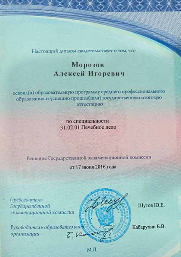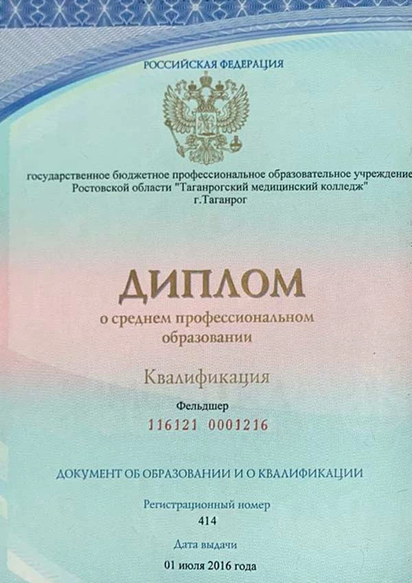 • 2016 г. — ГБПОУ «Таганрогский медицинский колледж» (специальность «Лечебное дело»);
